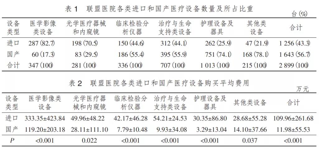 中国医科大学肿瘤医院、辽宁省肿瘤医院等相关负责人也曾对辽宁省肿瘤联盟医院医疗设备购买和使用情况进行分析,共调查 2899 台医疗设备,各类进口和国产医疗设备所占比重及购买平均费用见下表。