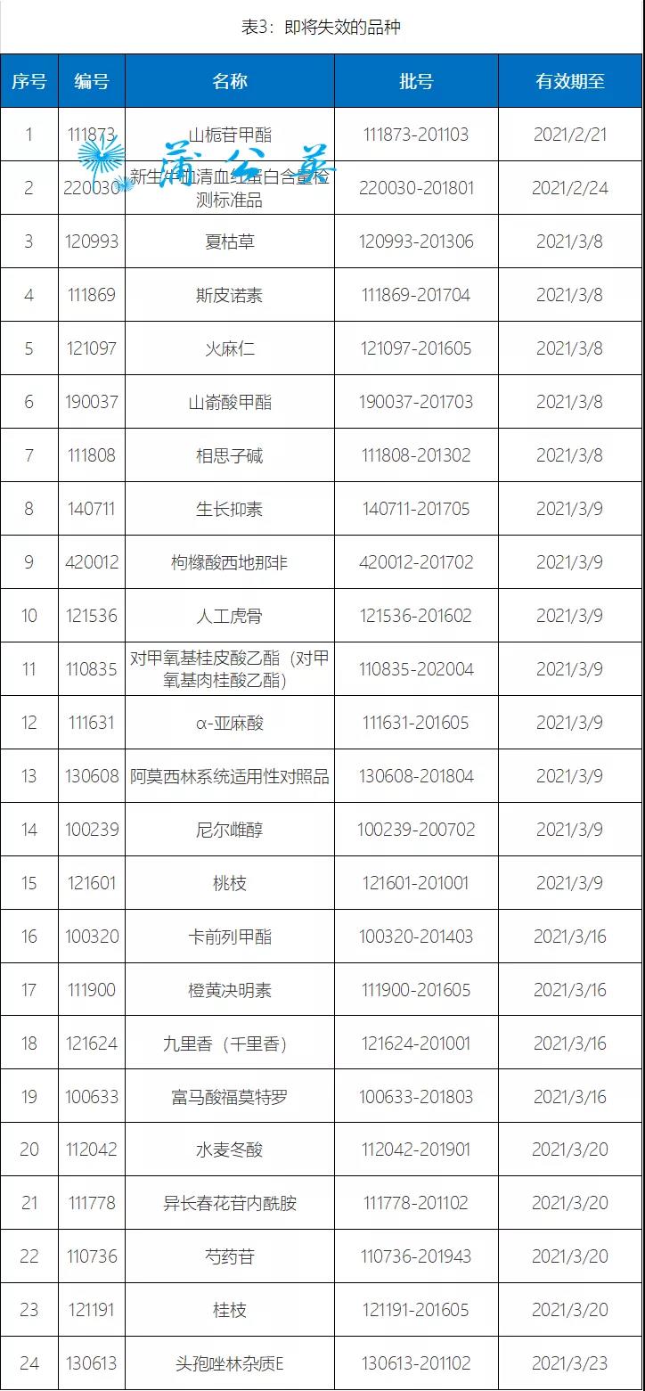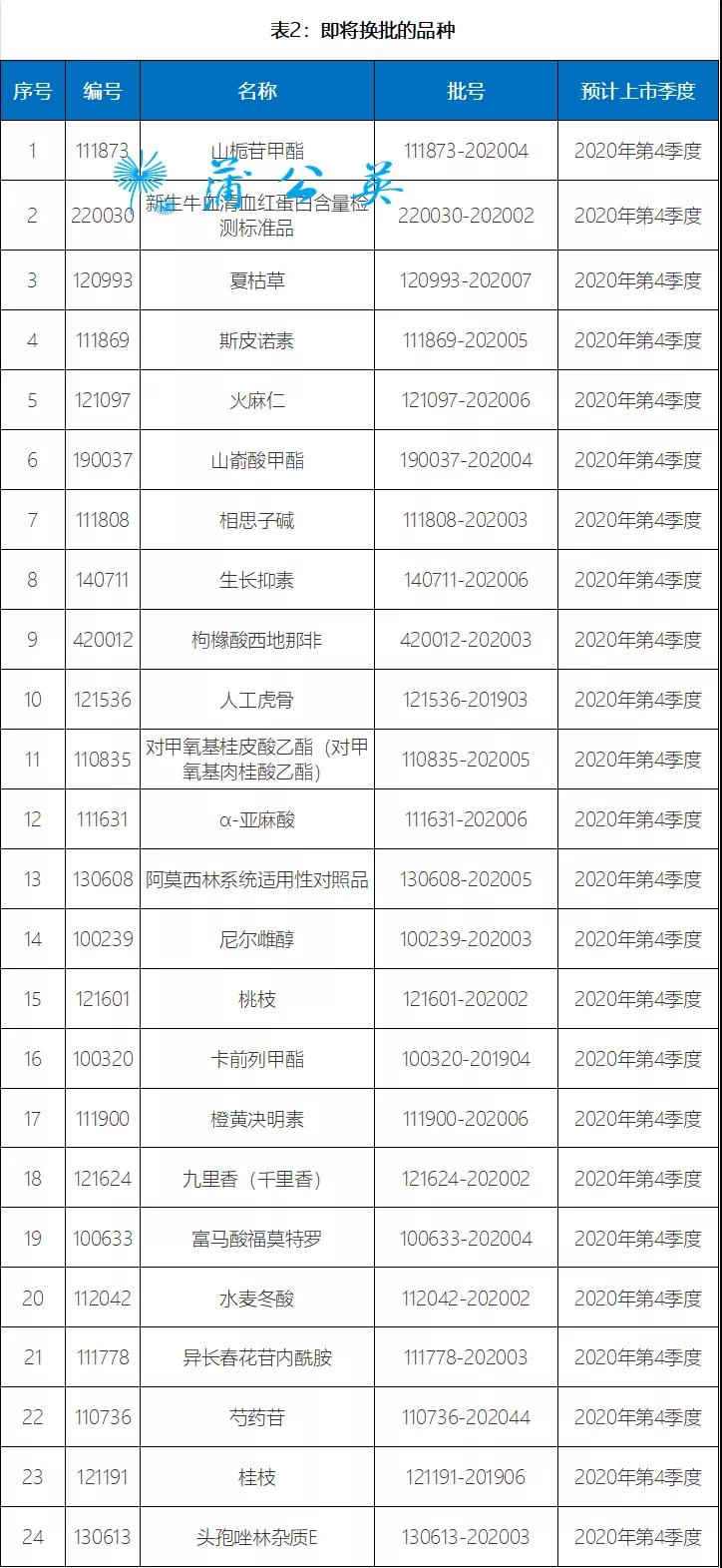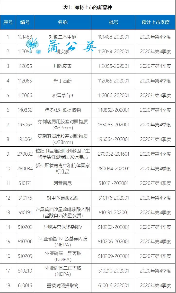 现发布2020年第十期国家药品标准物质供应新情况,包括18个即将上市的新品种,24个即将换批品种的预计上市时间,24个即将失效品种的有效使用期限和4个停用品种名单,详见表1、表2、表3和表4。
