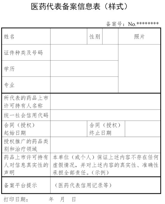 备案后,药品上市许可持有人应当在本公司网站上公示所聘用或者授权的医药代表信息(备案号、企业名称和代码、姓名、性别、照片、负责推广的药品类别和治疗领域、劳动合同起止日期)。