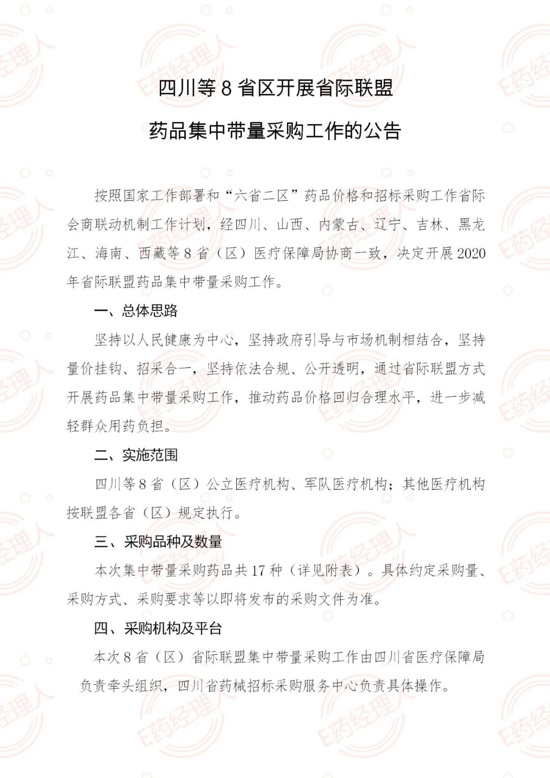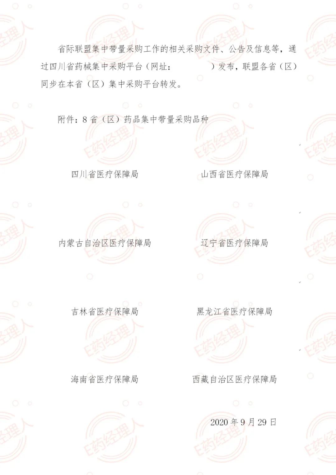 医药网10月9日讯 9月29日,E药经理人从业内获得一份名为《8省区开展省际联盟药品集中带量采购工作的公告》,该公告落款为四川、山西、辽宁、吉林等8省区的医保局,落款日期为9月29日。