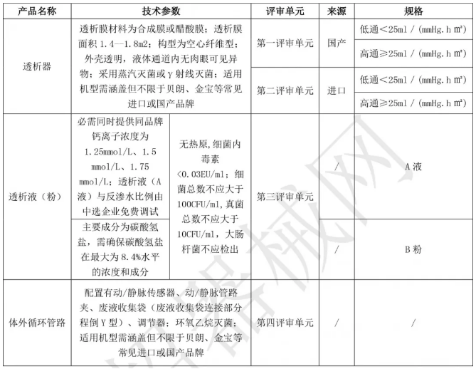 《意见稿》显示三个采购品种共分为4个评审单元,都明确了技术参数需求,其中透析器依据医疗器械注册证分为国产和进口两个层次,同一层次、同一产品目录的产品为一个评审单元,同一评审单元视为同一质量层次,各评审单元遴选2家生产企业。