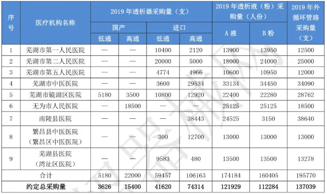 根据《意见稿》,芜湖市所有公立医疗机构将对血透类医用耗材中透析器、透析液(粉)、体外循环血路三个品种进行带量采购,采购量不低于全市公立医疗机构上年度同期该产品采购量的70%(2019年度具体采购量如下),总计506211支,采购周期为2年。
