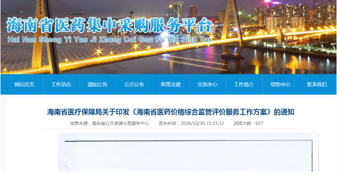 医药网10月12日讯 10月10日,海南省医疗保障局印发《海南省医药价格综合监管评价服务工作方案》(以下称《工作方案》),指出将通过引入第三方服务,完善医药价格监测系统,实现与医药集中采购服务平台互联互通。
