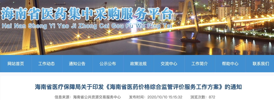 10月10日,海南省医疗保障局印发《海南省医药价格综合监管评价服务工作方案》,意在建立医药价格监测预警分析体系,真正挤压药品(医用耗材)价格虚高空间,确保药品(医用耗材)供应和配送及时到位、临床安全有效。