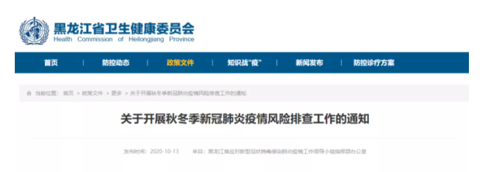 10月12日,黑龙江省应对新型冠状病毒感染肺炎疫情工作领导小组指挥部办公室下发了《关于开展秋冬季新冠肺炎疫情风险排查工作的通知》(以下简称《通知》)。