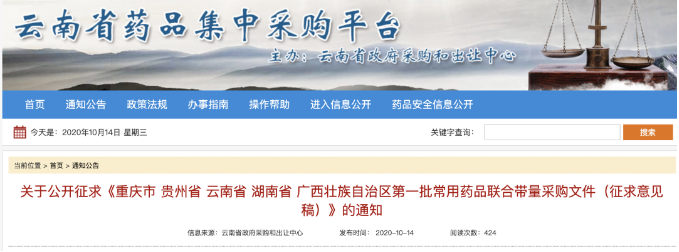 10月14日,云南省药品集中采购平台挂出《重庆市 贵州省 云南省 湖南省 广西壮族自治区 第一批常用药品联合带量 采购文件(征求意见稿)》,意味着5省(市、区)第一批常用药联合带量采购,正式开始;本次采购主要涉及18个临床用量大、采购金额高且竞争较为充分的常用药。