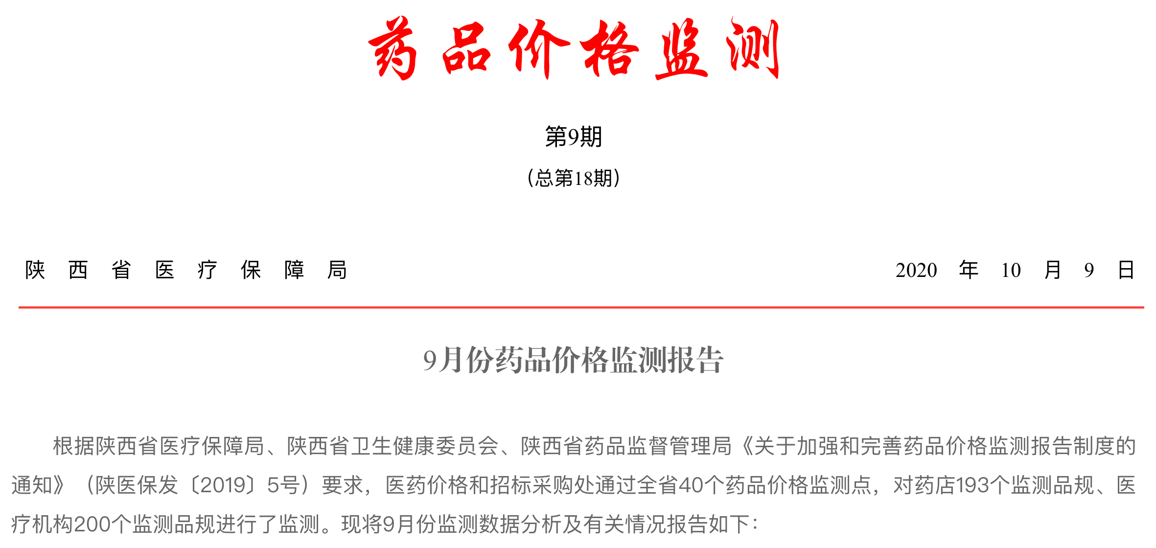 为进一步做好药品价格监测工作,陕西省医保局、陕西省卫健委、陕西省药监局三部委在2019年4月发布《关于加强和完善药品价格监测报告制度的通知》,旨在通过建立健全药品价格监测体系和加强药品价格监测数据分析,来引导市场价格合理形成,维护市场价格秩序。