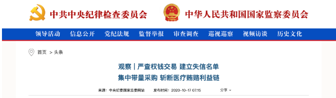 10月17日清晨,中共中央纪律检查委员会发布头条文章《严查权钱交易,建立失信名单,集中带量采购,斩断医疗贿赂利益链》。