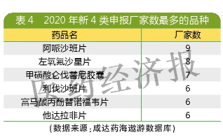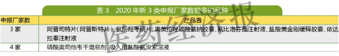 2020年,暂无化学药新3类申报厂家数超过5家的品种。大部分申报新3类的还是国内同通用名已有厂家上市的品种,例如美金刚、氟比洛芬、依达拉奉、奥司他韦和氨溴索。这类品种有可能豁免验证性临床证据,吸入溶液和注射剂有可能连生物等效性试验也不用做,实际上所投入的成本和新4类差不多。