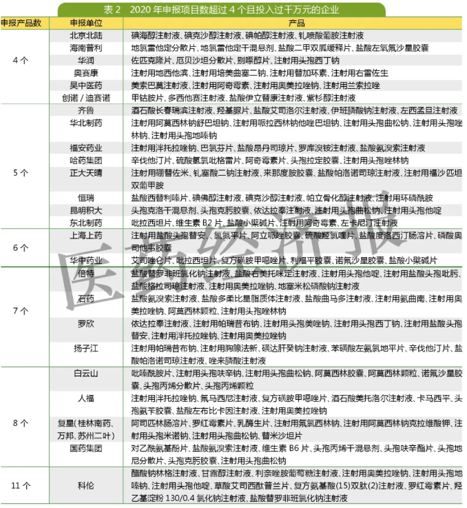超过20家企业在2020年申报的项目数超过4个且投入过千万。普通注射剂以每个项目200万~300万计算,4个项目就过千万;而需要做BE的口服药一个项目600万~1200万。科伦虽然项目数目前最多,共11个,但9个是注射剂,实际上投入未必高于有复杂注射剂盐酸多柔比星脂质体注射液的石药集团。