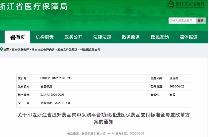 公示指出,根据《浙江省提升药品集中采购平台功能推进医保药品支付标准全覆盖改革方案》精神,按照上级统一部署,现将企业申请暂停在线交易产品信息予以公示,公示时间:2020年10月20日至2020年10月26日。