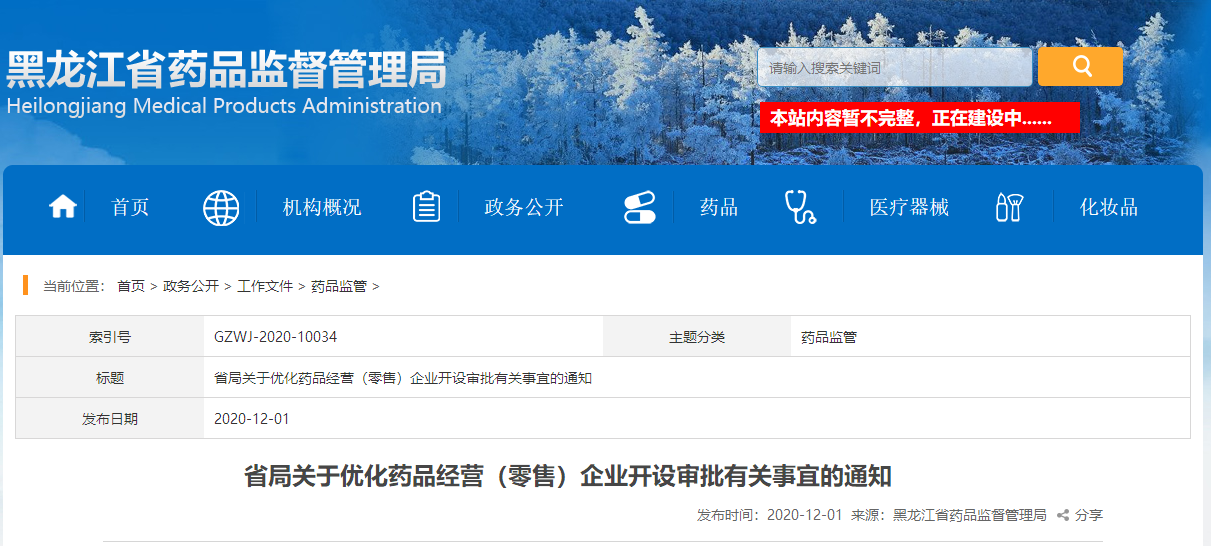 12月1日,黑龙江省药监局印发了《关于优化药品经营(零售)企业开设审批有关事宜的通知》(以下简称《通知》)。