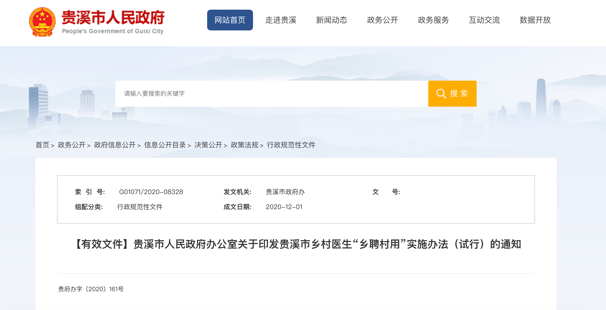 12月1日,江西省贵溪市人民政府办公室发布《关于印发贵溪市乡村医生“乡聘村用”实施办法(试行)的通知》(以下简称《办法》)。