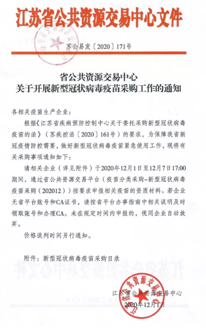 12月1日,江苏省公共资源交易中心发布《关于开展新型冠状病毒疫苗采购工作的通知》(以下简称“通知”)。通知指出,为保障江苏省新冠疫情防控工作的需要,江苏省将进行三款新冠疫苗的采购工作。