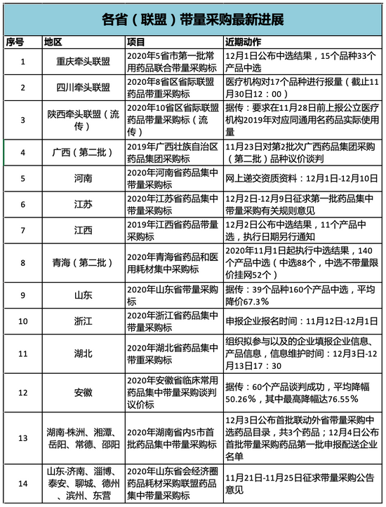 而纵览其余各省(联盟)开展的药品带量采购开展情况,各自进度不一。不过临近年末,近期各地集采动态增多。据业内消息,医药大省山东的首批药品带量采购日前公布报价结果,整体价格下降67.3%、最高降幅98.6%。而由重庆牵头的五省市第一批常用药品联合带量采购结果也在近期浮出水面,15个品种33个产品成功中选。近期值得关注的还有正在组织拟参与企业填报信息的湖北33个注射剂带量采购,以及对第一批药品集中带量采购有关规则征求意见的江苏。