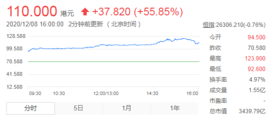 医药网12月9日讯 12月8日,京东健康(6618)正式在香港联交所主板挂牌上市。今日开盘,京东健康即大涨逾30%,到午后涨幅一度超70%,市值超3800亿港元,暂领先阿里健康(市值约3200亿港元),远超平安好医生(市值约1049亿港元)。截至收盘时,京东健康股价为110港元,涨幅55.85%,上市首日即高开高走。