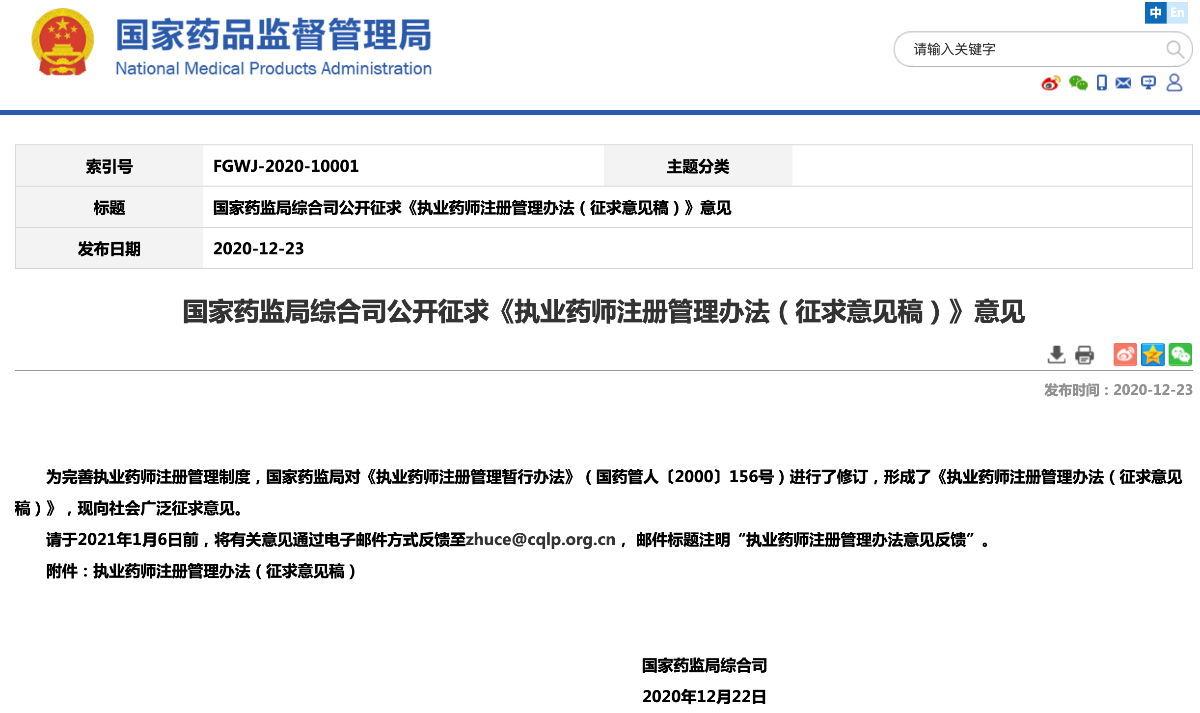 医药网12月24日讯 为完善执业药师注册管理制度,国家药监局对《执业药师注册管理暂行办法》(国药管人〔2000〕156号)进行了修订,形成了《执业药师注册管理办法(征求意见稿)》(以下简称《意见稿》),于12月23日正式对外发布,意见征求截止时间为2021年1月6日。