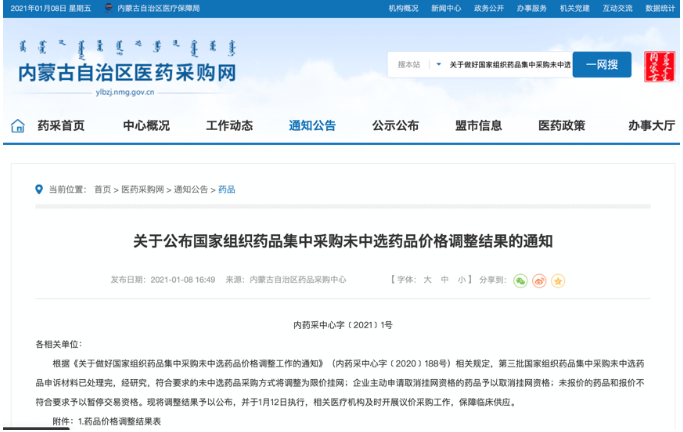 翻看内蒙古自治区医保局下发的《关于做好国家组织药品集中采购未中选药品价格调整工作的通知》可以发现,其调整规则与大部分省份类似。面对临床端切实存在的非中选药品合理用药需求,鼓励未中选药品自主降价成为各地的主流做法。