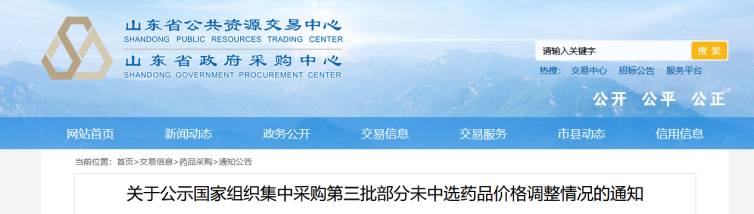 近日,山东省公共资源交易中心发布通知《关于公示国家组织集中采购第三批部分未中选药品价格调整情况的通知》(以下简称“《通知》”)。