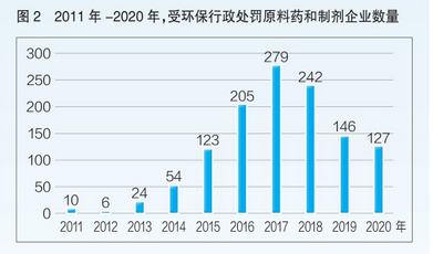 从2011年—2020年受罚原料药和制剂企业数量(见图2)可以看出,其变化曲线与企业被罚总次数曲线走势一致,均在2017年达到峰值(被罚企业数达279家),而后虽然呈现下降趋势,但被罚企业数依旧高于2017年前,制药企业环保压力仍在。