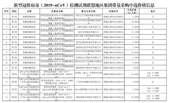 核酸快速检测试剂中标企业为达安基因,最低价为12元