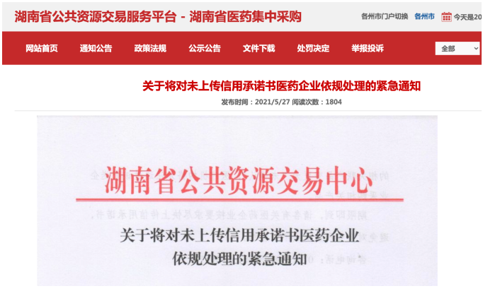 医药网5月28日讯 5月27日,湖南省公共资源交易中心发布《关于将对未上传信用承诺书医药企业依规处理的紧急通知》。湖南表示,截止2021年5月26日,仍有少数医药企业未上传信用承诺书,明确至2021年6月1日前仍未提交信用承诺书的医药企业,将按照相关规定处理。针对其中的生产企业(含国内总代),湖南将停用其全部中标(挂网)产品并关闭交易系统功能。