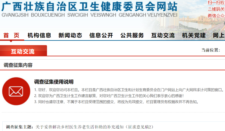 经基层医师公社了解,早在去年年底,广西壮族自治区卫健委就已发布《关于妥善解决乡村医生养老生活补助的补充通知(征求意见稿2)》,公开征求过大家的意见。