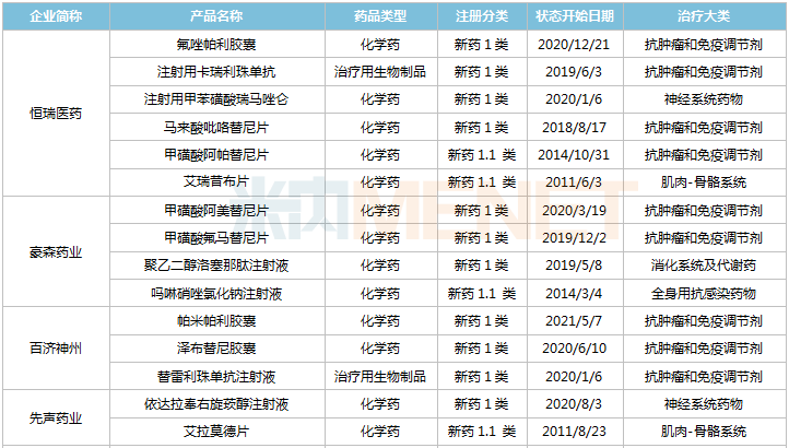 60款国产1类新药涉及40多家企业(以集团计),恒瑞、豪森、百济神州、先声、贝达、歌礼、和记黄埔等10家企业获批品种数达2个及以上。