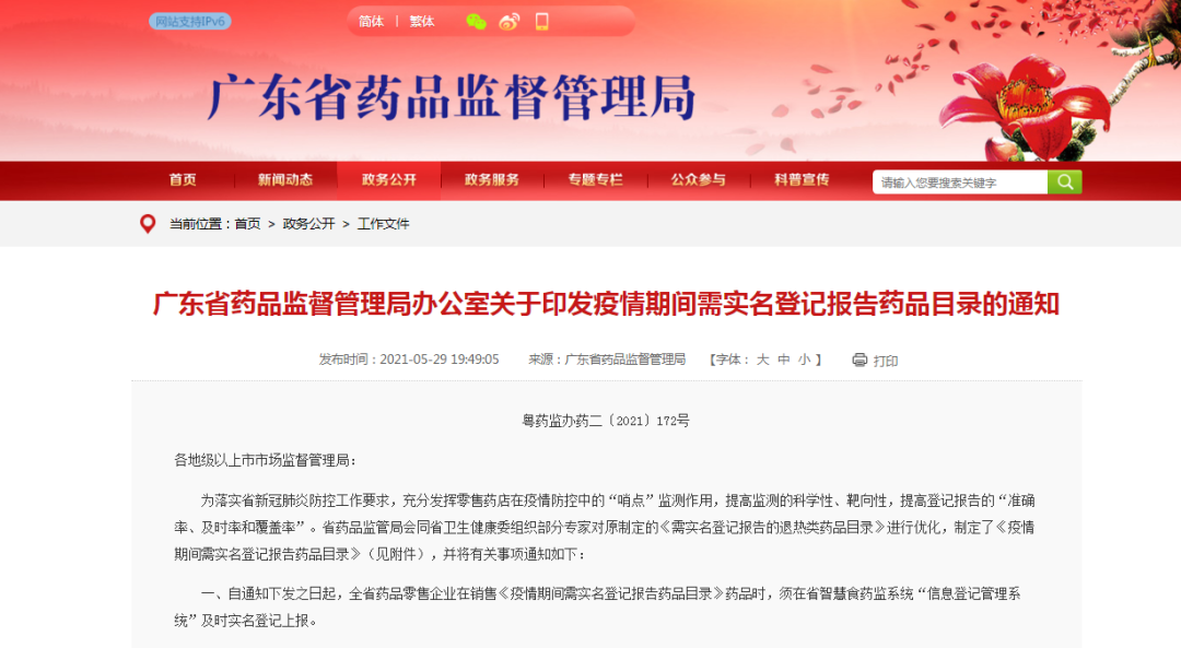 《通知》指出,为落实广东省新冠肺炎防控工作要求,充分发挥零售药店在疫情防控中的“哨点”监测作用,提高监测的科学性、靶向性,提高登记报告的“准确率、及时率和覆盖率”,广东省药监局会同广东省卫生健康委组织部分专家,对原制定的《需实名登记报告的退热类药品目录》进行优化,制定了《疫情期间需实名登记报告药品目录》(详见文末)。