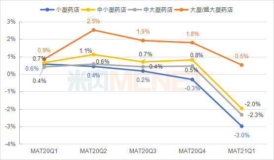 在疫情的洗礼之下,消费者健康意识有所提升,一些常见病患病减少,同时,部分城市药店禁止销售常见病的感冒止咳类等药物,再加上春节期间大多药店不营业,在多重因素的夹杂之下,使得2021年一季度以治疗常见病药物销售为主的中小药店的销售业绩受到冲击,对于大型/超大型药店而言,在医保、处方外流及国家集采等政策的催化下,抗肿瘤用药等重、慢病用药成为其主要销售对象,从而减轻其销售增速的下滑进程。在疫情防护成为常态化后,器械类的销售份额较2020年一季度有所回落,但仍高于2019年一季度。保健品与饮片在2020年疫情的冲击下,去实体药店购买需求减少,2021年市场虽有回暖,但未能达到2019年的状态。