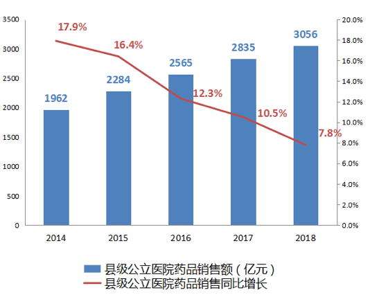 在分级诊疗制度的顶层设计下,基层医疗市场正在迎来爆发。米内网数据显示,2018年县级公立医院药品销售额达3056亿元,其中,全身用抗感染药物、消化系统及代谢药物、血液和造血系统药物及心血管系统药物、神经系统药物位列前五。
