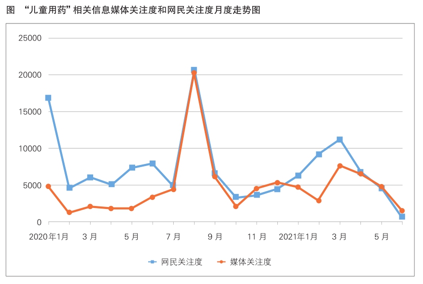以2020年1月1日—2021年6月3日为监测时间段,“儿童用药”相关信息媒体关注度和网民关注度均在2020年8月达到顶峰(见图)。