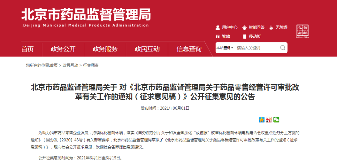日前,北京市药品监督管理局就《北京市药品监督管理局关于药品零售经营许可审批改革有关工作的通知(征求意见稿)》(以下简称《意见稿》)面向社会公开征求意见,就促进药品零售行业发展提出多项举措。