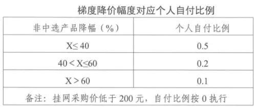 在梯度降价周期结束后,视情调整医保支付上限。降价幅度大于60%,医保个人支付比例为0.1,挂网采购价低于200元,自付比例按0执行。