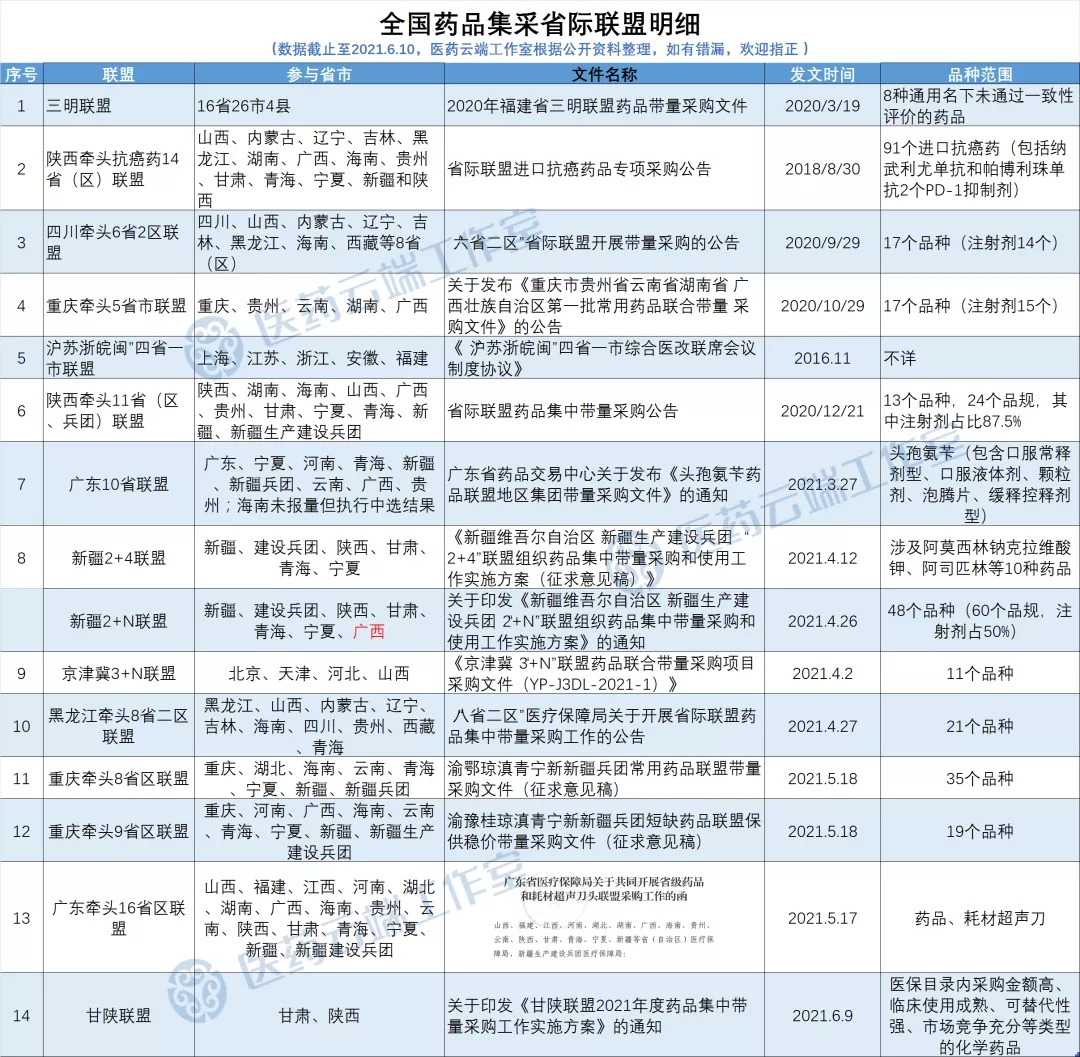医药网6月15日讯 目前药品集采省际联盟达到14个。包括三明联盟、陕西牵头11省联盟、陕西牵头抗癌药14省(区)联盟、重庆牵头5省联盟、四川牵头六省二区联盟、“沪苏浙皖闽”四省一市联盟、广东牵头10省联盟、京津冀“3%20N”联盟、新疆“2%20N”联盟、黑龙江牵头八省二区联盟、重庆牵头8省区常用药联盟、重庆牵头9省区短缺药联盟、广东牵头16省区联盟、甘陕联盟。此外,长三角联盟也在酝酿中。