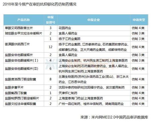 此外,还有琥珀酸去甲文拉法辛缓释片、盐酸安非他酮缓释片(Ⅰ)、盐酸安非他酮缓释片(Ⅱ)三个产品均无仿制药企业获批,其中,琥珀酸去甲文拉法辛缓释片仅有宜昌人福药业独家报产。有市场专家认为,“随着大批原研药到期,以及仿制药市场竞争加剧,价格下降成为大趋势,布局首仿药有利于企业获得竞争优势。”