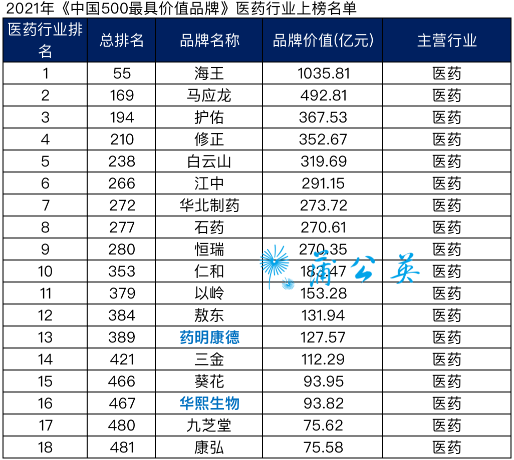 医药行业品牌价值前10名,与2020年相比在总榜排名变化方面:
