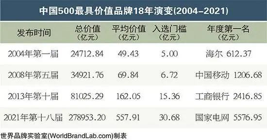 世界品牌实验室编制中国品牌报告已是第18个年头,2004年入选门槛仅为5亿元,前500名品牌的平均价值为49.43亿元。18年以后的2021年,入选门槛已经提高到30.68亿元,而前500名品牌的平均价值高达557.91亿元,增加幅度为1028.69%。