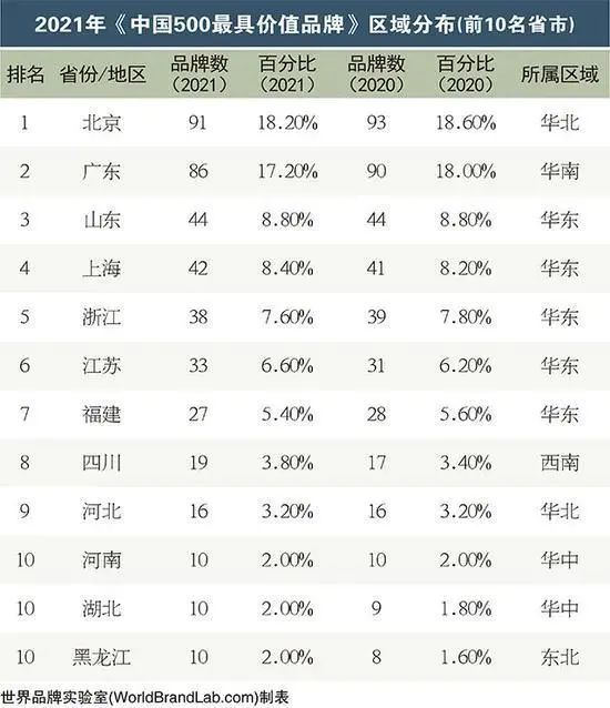 从本届《中国500最具价值品牌》区域分布来看,北京有91个品牌入选,名列第一,主要原因是赢利能力强的央企总部集中在北京;广东和山东分别有86个和44个品牌入选,位居第二和第三。