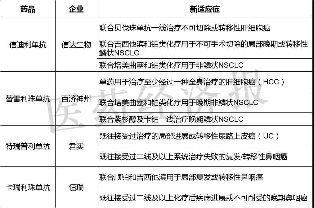 四大国产PD-1药物新增适应症情况
