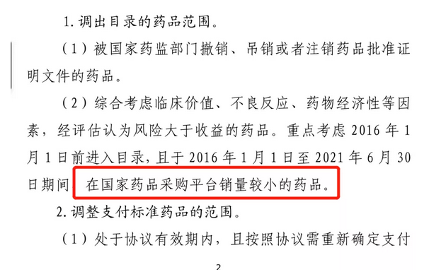 综合考虑临床价值、不良反应、药物经济性等因素,经评估认为风险大于收益的药品。重点考虑2016年1月1日前进入目录,且于2016年1月1日至2021年6月30曰期间,在国家药品采购平台销量较小的药品。