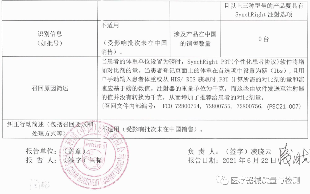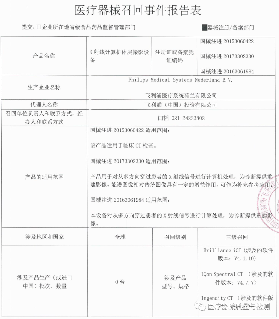 飞利浦(中国)投资有限公司报告,由于涉及特定型号、特定批次产品,存在当患者的体重单位设置为磅时,SynchRight P3T(个性化患者协议)软件将增加对比剂量的问题,生产商飞利浦医疗系统荷兰有限公司Philips Medical Systems Nederland B.V.对X射线计算机体层摄影设备Computed Tomography System(注册证号:国械注进20153060422、国械注进20173302330、国械注进20163061984)主动召回。召回级别为三级。