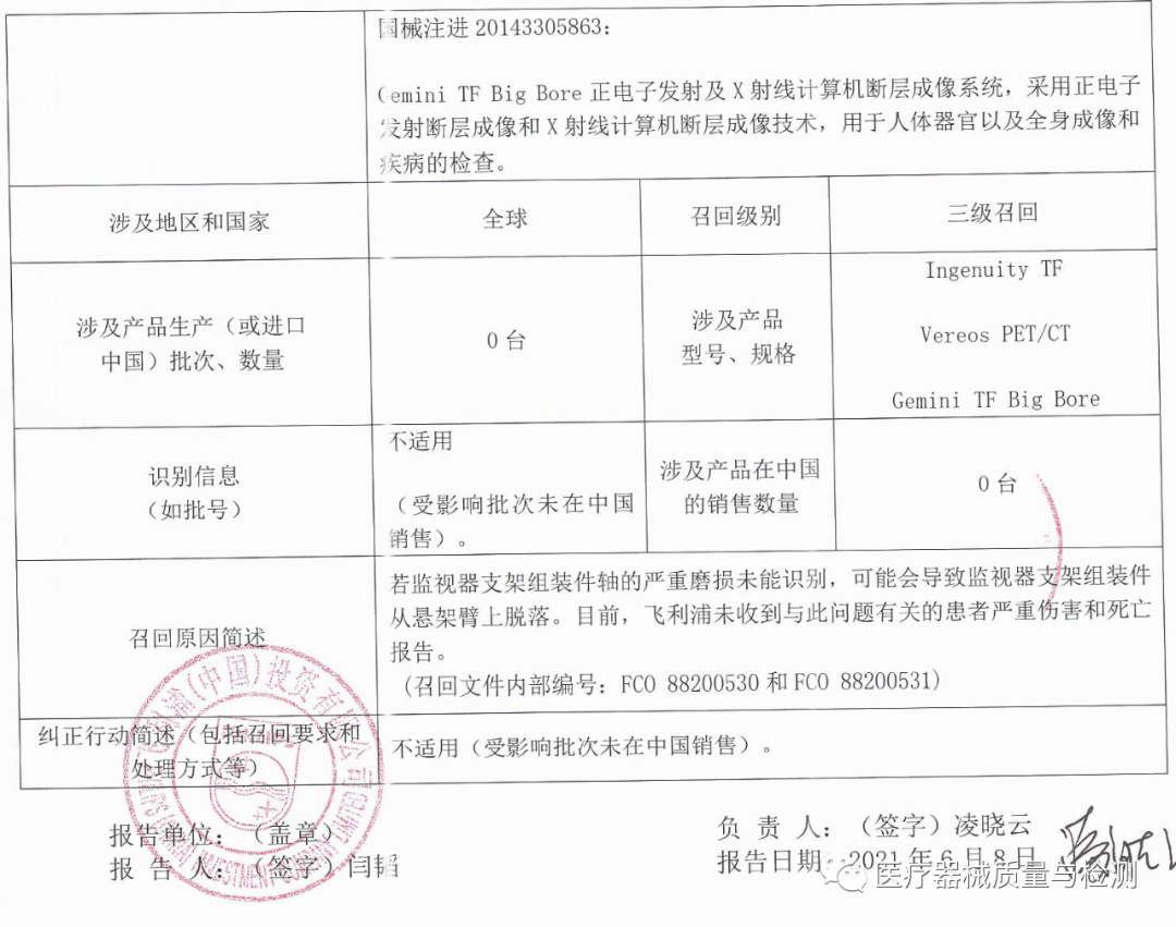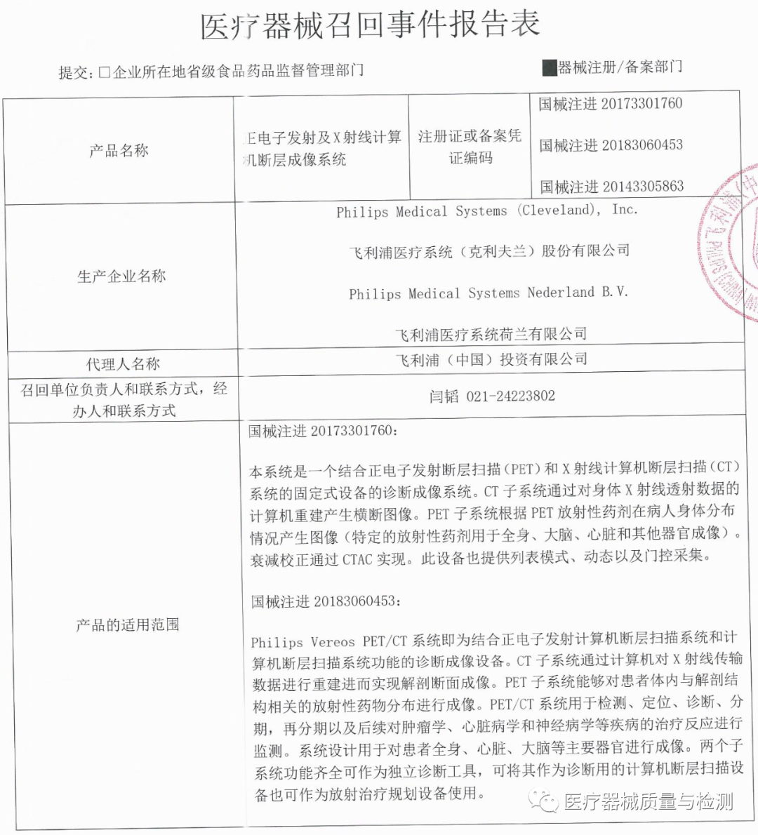 飞利浦(中国)投资有限公司报告,由于涉及特定型号、特定批次产品,存在若监视器支架组装件轴的严重磨损未能识别,可能会导致监视器支架组装件从悬架臂上脱落的问题,生产商Philips Medical Systems(Cleveland), Inc飞利浦医疗系统(克利夫兰)股份有限公司对正电子发射及X射线计算机断层成像系统PET/CT Imaging System(注册证号:国械注进20143305863、国械注进20173301760、国械注进20183060453)主动召回。召回级别为三级。