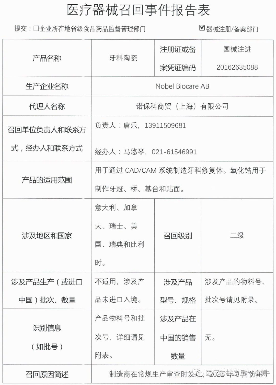 诺保科商贸(上海)有限公司报告,由于涉及特定型号、特定批次产品,存在2021年3月份用于生产的一台烧结炉未达到合适的烧结曲线问题,生产商Nobel Biocare AB对牙科陶瓷 Nobel Procera Dental Ceramics(注册证号:国械注进20162635088)主动召回。召回级别为二级。