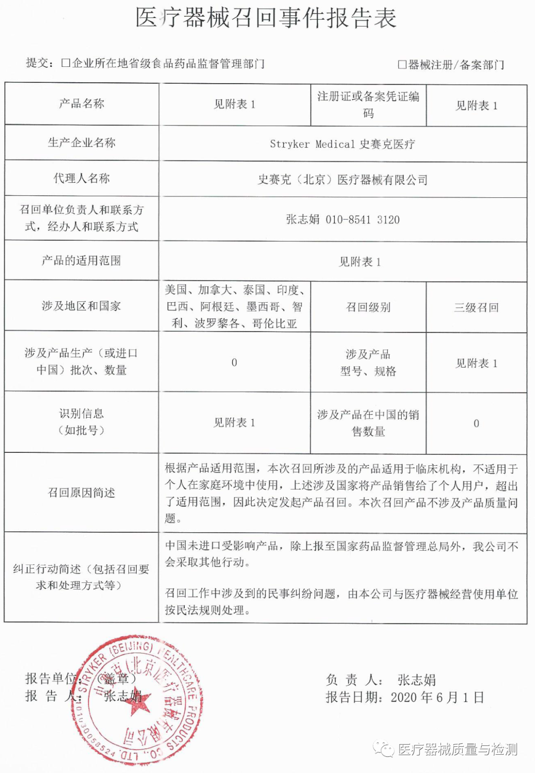史赛克(北京)医疗器械有限公司报告,由于本次召回产品适用于临床机构,不适用于个人在家庭环境中使用,本次召回涉及国家将产品销售给个人用户,超出了适用范围的问题,生产商史赛克医疗Stryker Medical对医用电动病床Electrical Hospital Beds等医疗器械(注册证或备案凭证详见附件)主动召回。召回级别为三级。