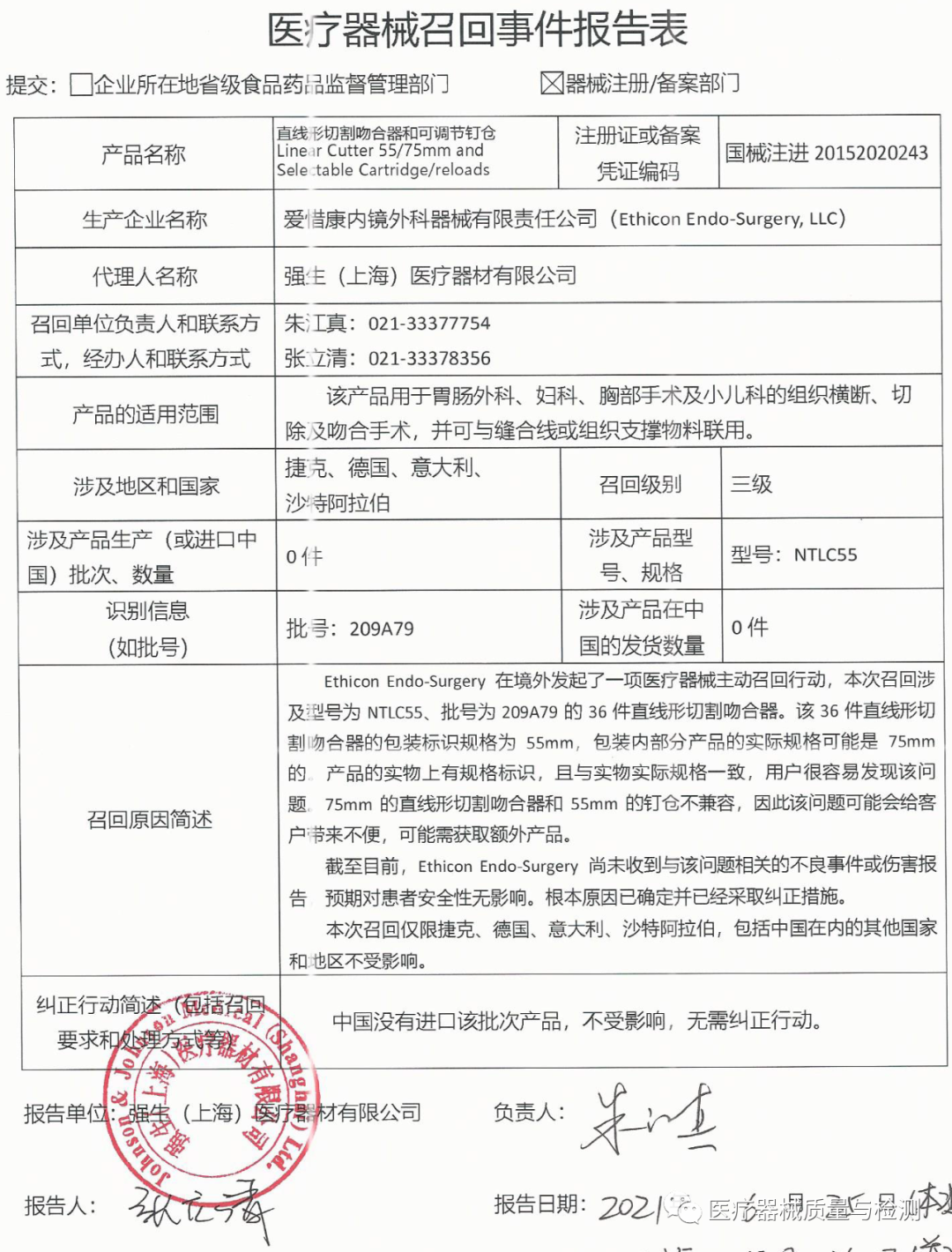 强生(上海)医疗器材有限公司报告,由于涉及特定型号、特定批次产品,存在包装内直线形切割吻合器和钉仓不兼容的问题,生产商爱惜康内镜外科器械有限责任公司Ethicon Endo-Surgery, LLC对直线形切割吻合器和可调节钉仓Linear Cutter 55/75mm and Selectable Cartridge/reloads(注册证号:国械注进20152020243)主动召回。召回级别为三级。
