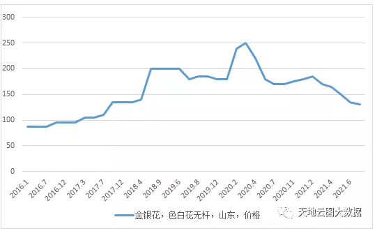 2020年,金银花价格突破历史新高,即青花240元,统货200元,当年4月疫情稳定后,其价格下滑回调并不多。
