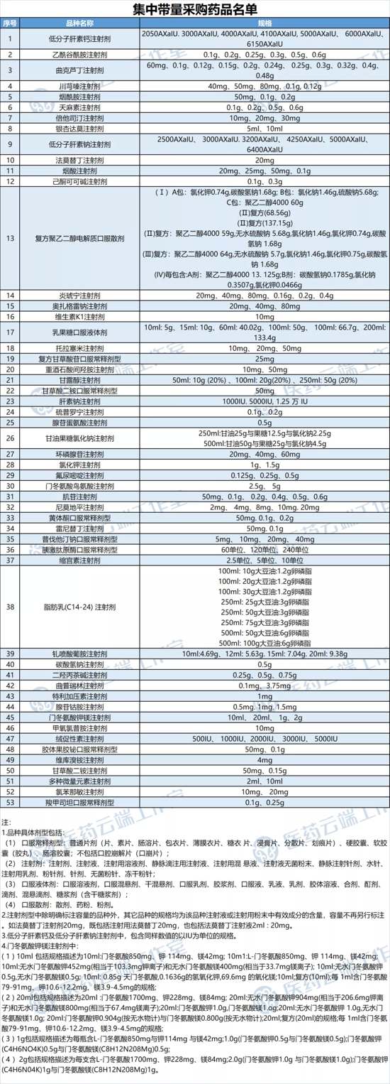 从公布的名单来看,注射剂有44个,占比83%,此外还包括7个口服常释剂型,1个口服散剂以及1个口服液体剂。