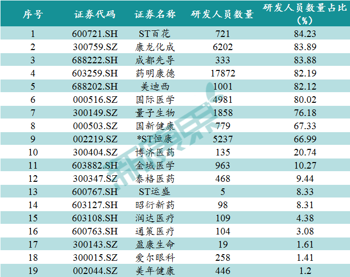 数据来源:同花顺,中康产业资本研究中心(注:以研发人员数量占比排序)