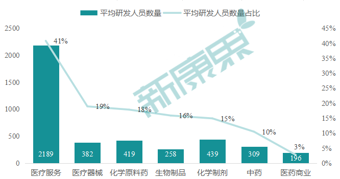 具体来看,七大子行业中,医疗服务一马当先,平均研发人员数量比例达到41%,而平均研发人员数量也达到2189,主要是由于医疗服务中合同组织外包企业占多数且规模较大,且其员工多为研发人员导致;其次,医疗器械、化学原料药、生物制品、化学制剂、中药研发人员配置比重均在10%以上,平均研发人员数量在200-500人之间,在一定程度上表明了目前从行业层面上来看,“药”、“械”企业自身的研发配置程度差别不太大;医药商业研发人员配置比重最低,仅3%,这主要是由于医药商业的业务属性导致,医药商业包括医药流通和医药零售,其业务极少涉及研发。